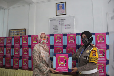 Selanjutnya, dipimpin oleh Kasat Lantas AKP Cerryn Nova MP SH MM, kegiatan penyerahan bantuan paket sembako oleh anggota Polwan Polres Bantul dilaksanakan di halaman TK Kemala Bhayangkari dan diterima langsung oleh perwakilan Warakawuri. (Humas Polres Bantul)